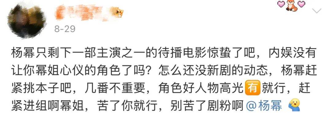 要知道,上次《惊蛰无声》官宣阵容,宋佳也压了杨幂,那时候粉丝不仅接受良好,甚至还主动宣传“番位不重要,有输出才是关键”、“每个角色都有存在的意义,好的演员在意的不应该是所谓的番位而是剧本”、“期待幂姐沉淀之后打翻身仗”。