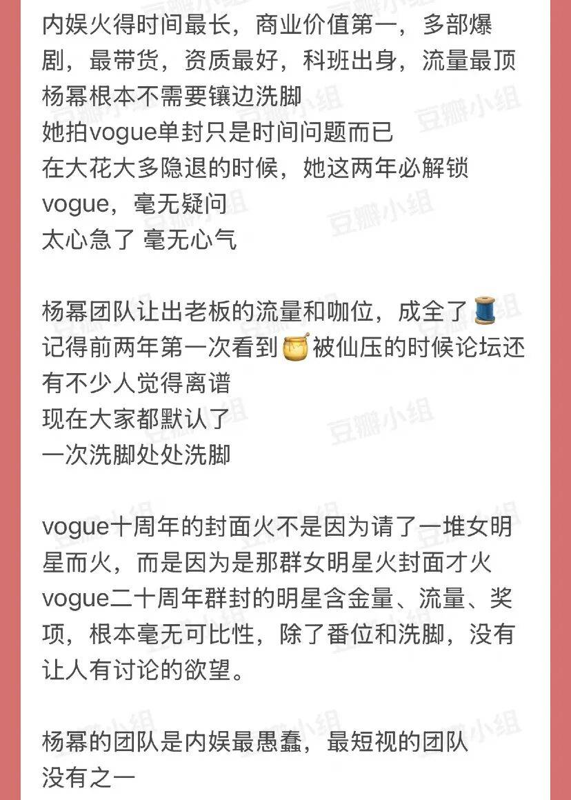 路人都在疯狂摇头,觉得以杨幂这资历和影响力,拍Vogue单封只是时间问题而已,根本不需要来群封镶边洗脚,她团队接这个通告简直是“内娱最愚蠢、最短视团队”候选第一名。