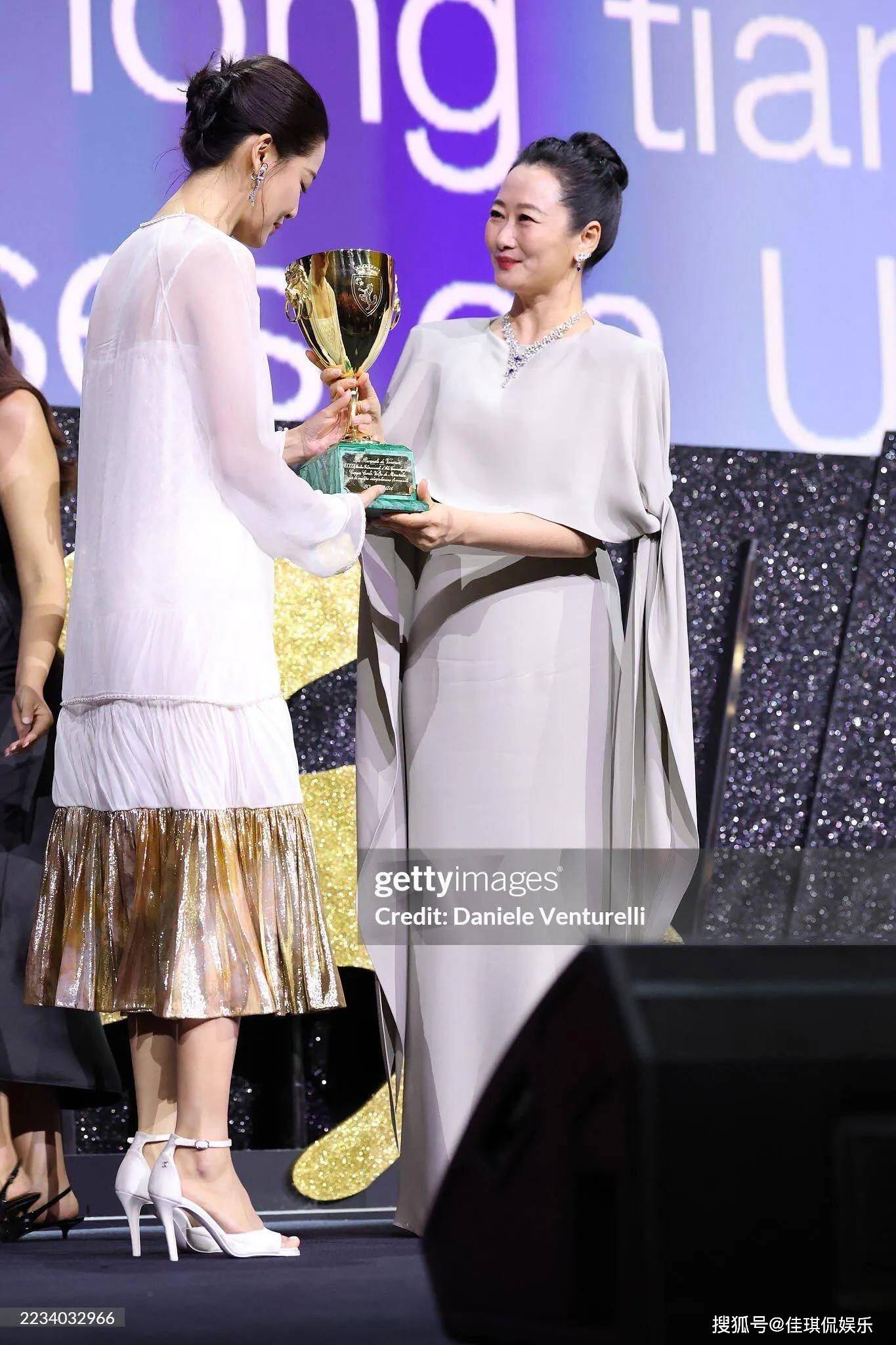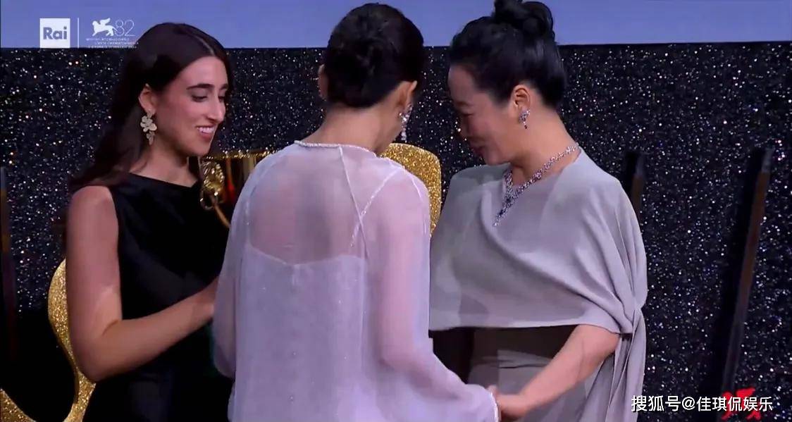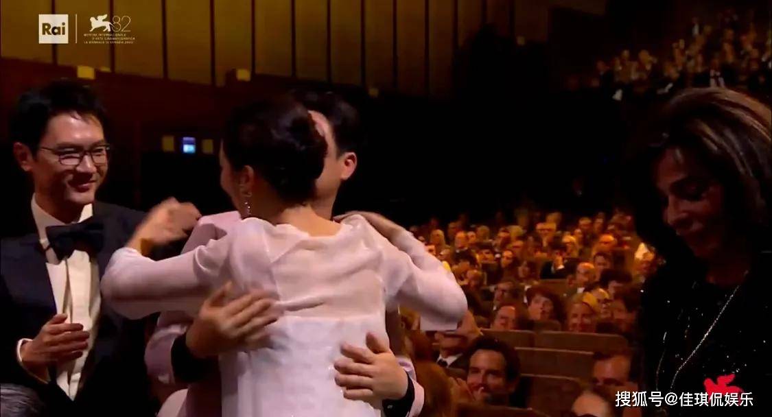 辛芷蕾穿着香奈儿礼服优雅的走上颁奖舞台,赵涛亲自给她颁奖。赵涛和辛芷蕾在舞台上拥抱在一起,两位漂亮的中国女人这一夜闪耀威尼斯。辛芷蕾从赵涛手上接过威尼斯电影节最佳女主角的奖杯,她把奖杯抱在怀里。赵涛把这个舞台留给了辛芷蕾,她眼神里都是骄傲与欣赏,这可是她亲自选出来的女主角啊。