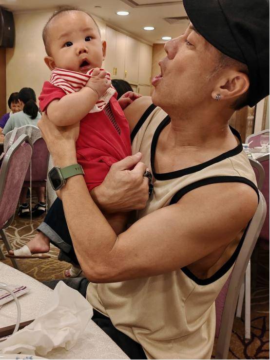 近日梁汉文在其社交平台上,上传他与家人在酒楼进餐的照片,只见照片中梁汉文正抱着一个小宝宝开心的对望,表情很是开心。