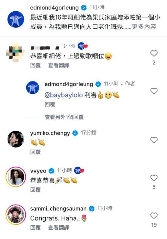 正当网民要恭喜梁汉文时,发现梁汉文在留言中写道,这是他们梁氏家族中最小的一位成员,是小他16岁的弟弟所生。