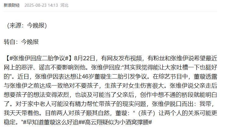 婚前达成共识的\"不育\"协定,婚后迅速被张维伊以\"创作瓶颈需要灵感\"\"延续家族血脉\"等话术瓦解。值得注意的是,当董璇态度松动时,相关话题高龄产妇风险随即登上热搜。