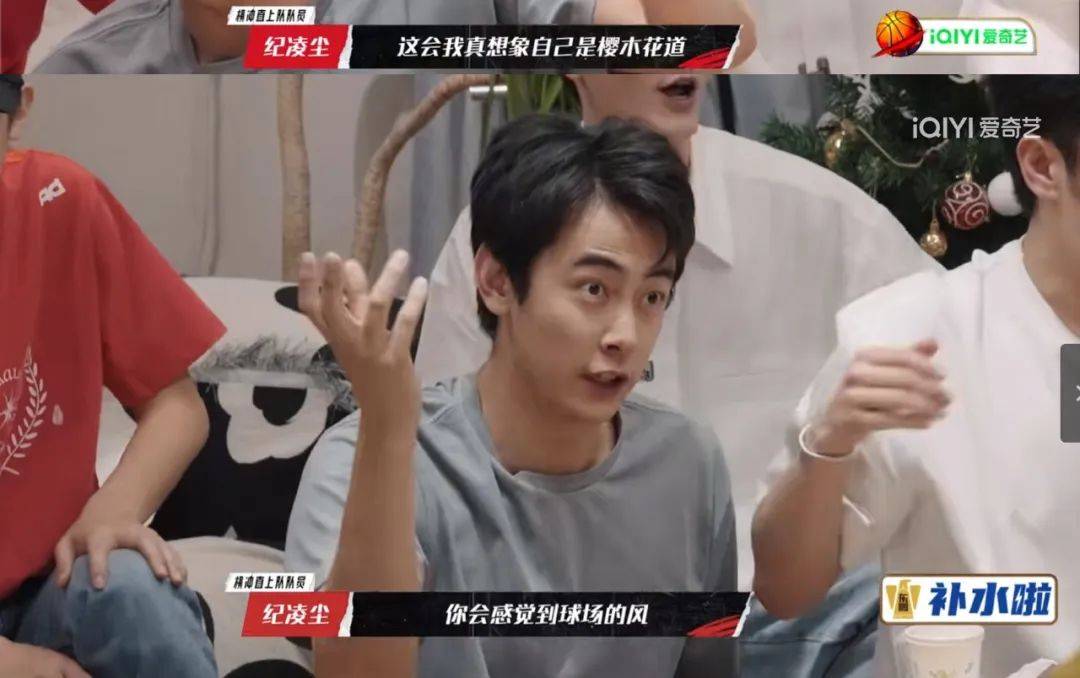 以纪凌尘为首的热血组在互捧,分配谁是樱木花道谁是流川枫,真正的球手孙悦捂耳朵:好吧,我就当什么都没听见。周柏豪、黄明昊吃饱喝足轮流摊在沙发上,字幕准确形容当时的场面:纪凌尘不停说说说说、剩下的人对对对对。