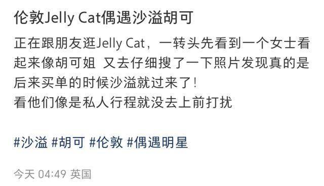 没想到的是,时隔多日后的今天(9月9日),有IP地址在英国的网友也遇到他们了。网友说,正在跟朋友在伦敦逛Jelly Cat,一转头先看到了一个女士,看起来很像胡可,又去搜了一下照片确认是本人。后来买单的时候,沙溢就过来了。