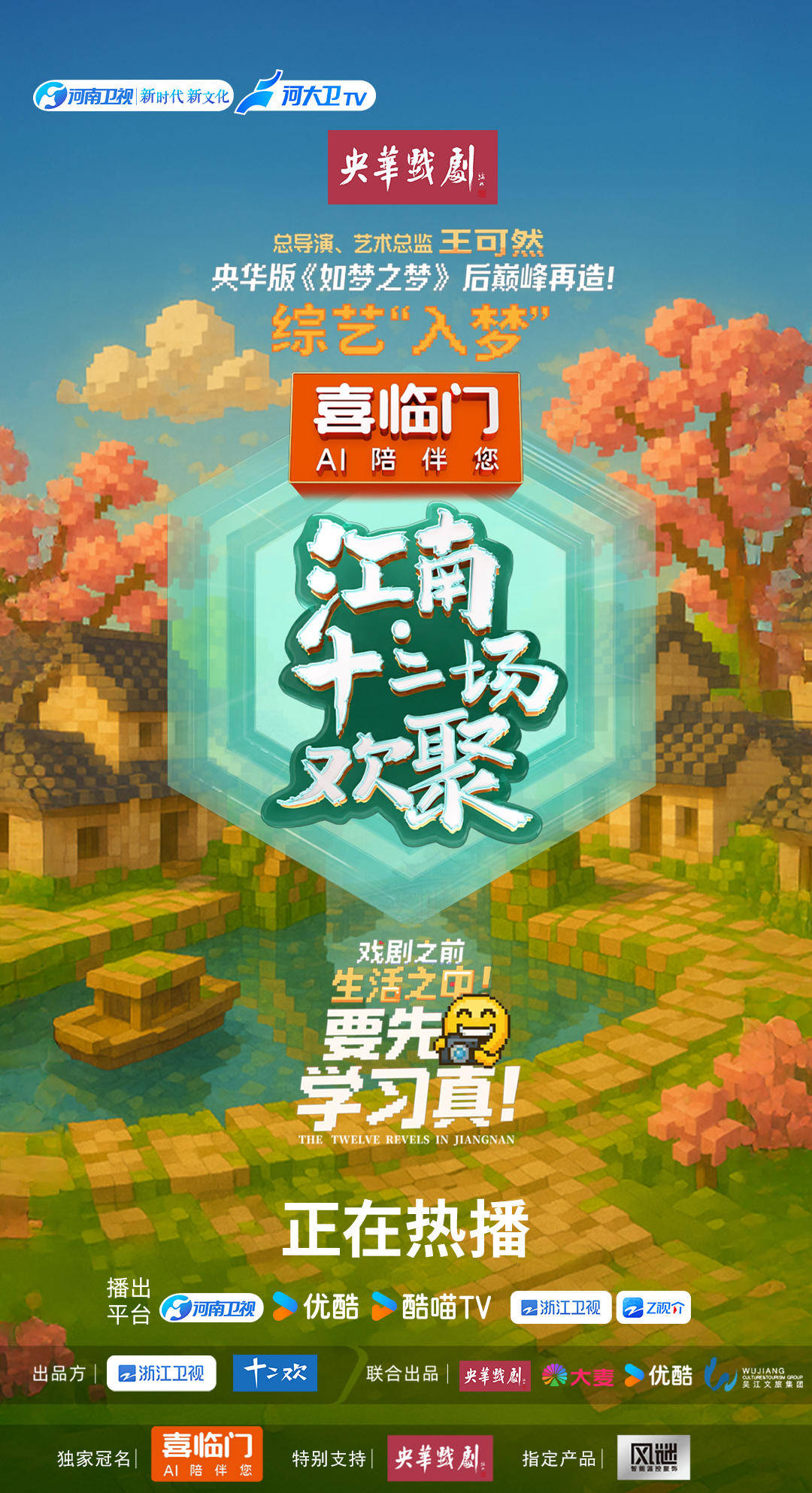 由央华、优酷、浙江卫视联合出品,河南卫视承制的中国首档沉浸式角色塑造真人秀《江南·十二场欢聚》于9月8日晚登陆河南卫视。在该节目中,来自全国的24位青年领取12位与江南有关的中国历史名士的人物卡牌,分别进入“衣食住”三大阵营。他们在同里古镇、垂虹桥、黎里古镇、震泽古镇、江村、博物馆等场景中游历学习,通过江南生活践行学习和在“真训营”校长王可然、班主任张凯丽、赵文瑄、徐俐等的“真训”表演科目中,学习劳作,学习手艺、学习文化、学习入戏,一步步靠近身份角色。经过层层选拔与考核,最终15位(有AB角)兼具传统文化底蕴与现代表演能力的“江南门生”成功突围,并带着12位中国名士的角色进入歌舞大戏《江南·十二场欢聚》中。