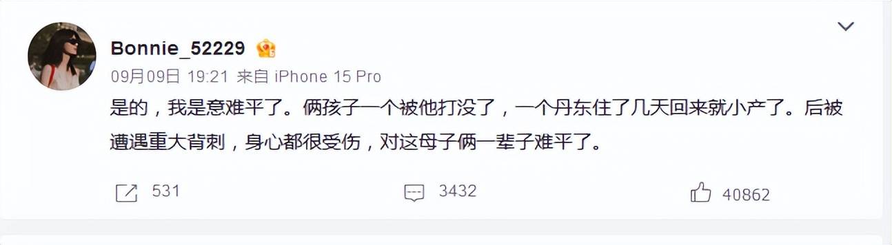 9月9日,黄景瑜前妻王雨馨发文称:“是的,我是意难平了。俩孩子一个被他打没了,一个丹东住了几天回来就小产了。后被遭遇重大背刺,身心都很受伤,对这母子俩一辈子难平了”,瞬间引发全网哗然。