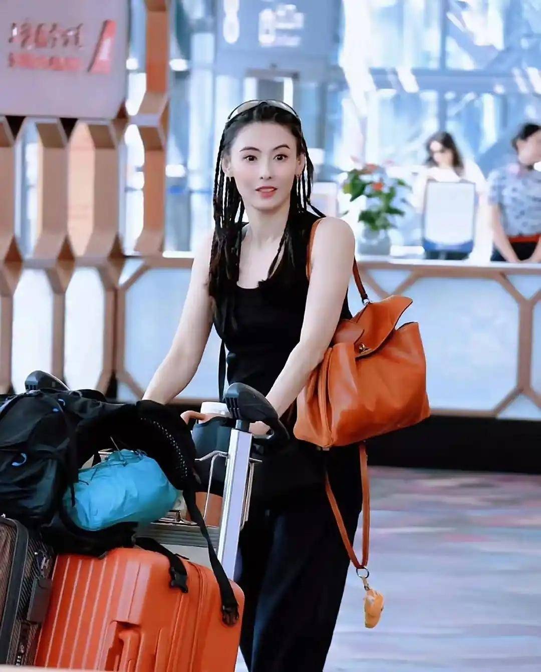 她一个人背了8个包,大包小包的,但一点都不显得狼狈,颜值依旧在线,肌肤白到发光。