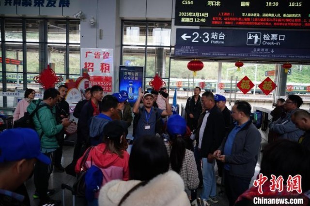 3月16日,云南省红河州河口县河口北站,一位导游组织越南旅游团候车。中新社记者 刘冉阳 摄