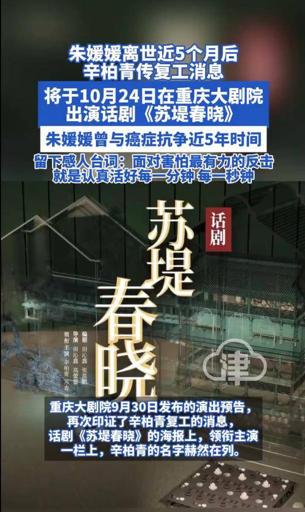 时隔近五个月,演员辛柏青的名字再次出现在公众视野——这一次,是在重庆大剧院的话剧海报上。这位在妻子朱媛媛去世后几乎从人间蒸发的男人,终于要重返舞台了。