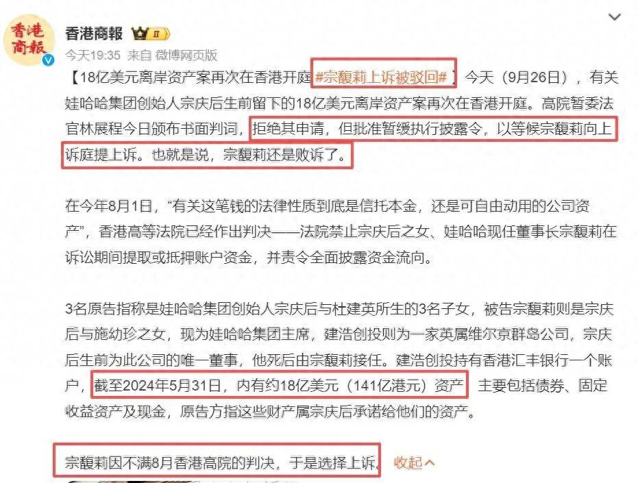 宗馥莉名下那笔价值18亿美元的巨额资产,依旧被冻结。