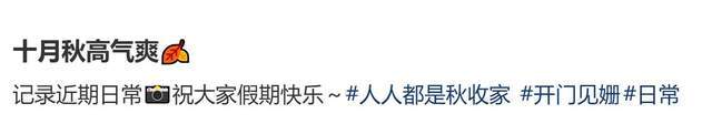 10月3日,韩庚妻子卢靖姗在个人社交平台晒出一组照片,她还附文写道:”记录近期日常,祝大家假期快乐。”