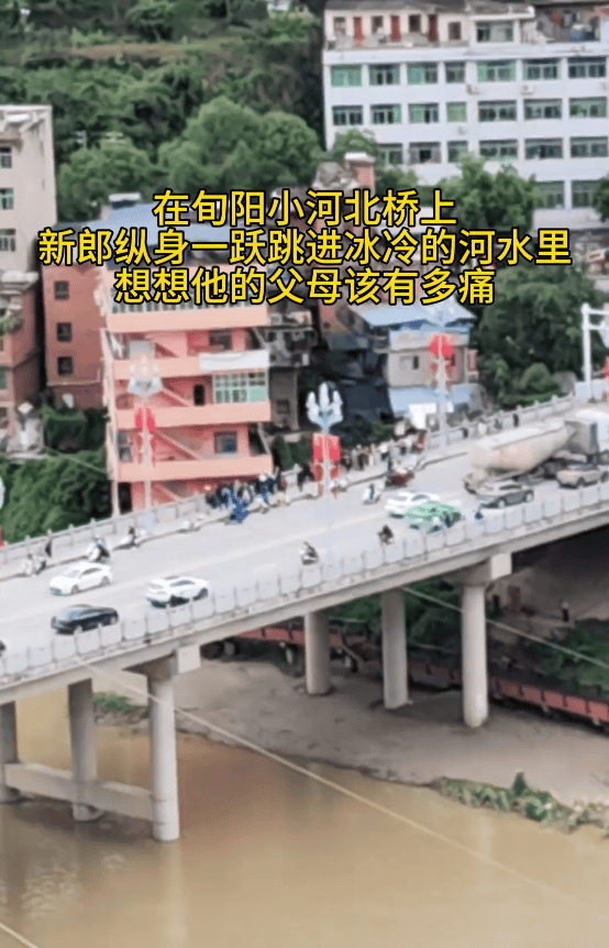 上午十一点左右,新郎走到旬河大桥。他身穿婚礼服装,被人看见直接翻过护栏跳进了河里。目击者说,河水很急,他跳下去后只冒了一下头,就被冲出去几十米,很快就再也看不到人了。