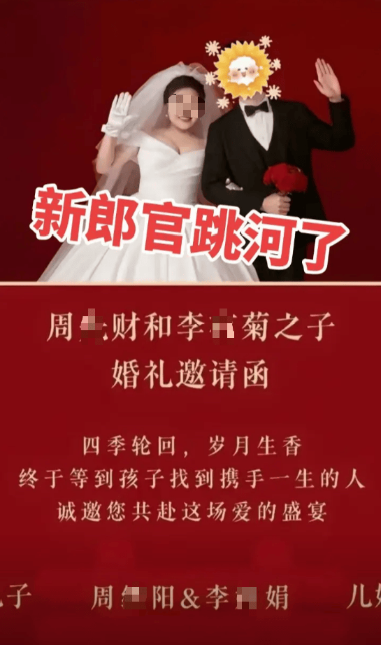 这桩事一传到网上,立刻引发热议。很多网友帮忙扒出双方的请柬,上面印着两人的名字和合影。新郎长得很阳光,笑容干净,看起来一点不像要在婚礼当天出走的人。甚至还有传言称,新娘在新郎跳河后也跟着跳下去,只是被及时救上来,身体无大碍。