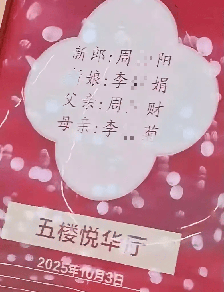 当天准备婚礼的酒店证实,中午的婚宴临时取消。大厅门口原本贴着的指示牌上,还能看到新郎新娘的名字,周某某和李某某。原本的安排是迎亲队伍接完新娘后,直接进酒店办宴席。可这一切,都停在了上午十一点。