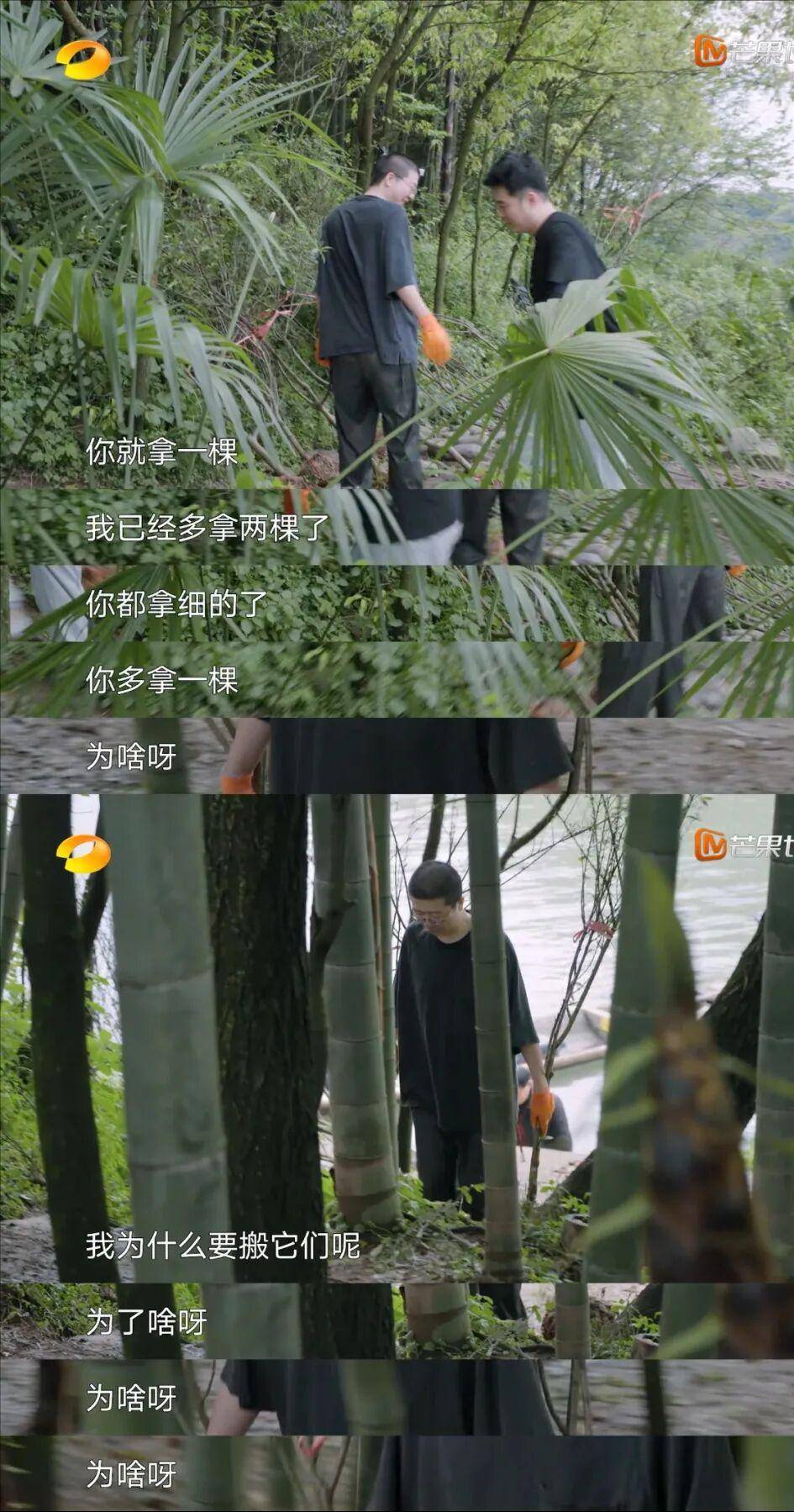 另一边是其他人沉默劳作的背景板,何老师搬树苗、黄老师挖坑、张艺兴运工具,忙得脚不沾地。