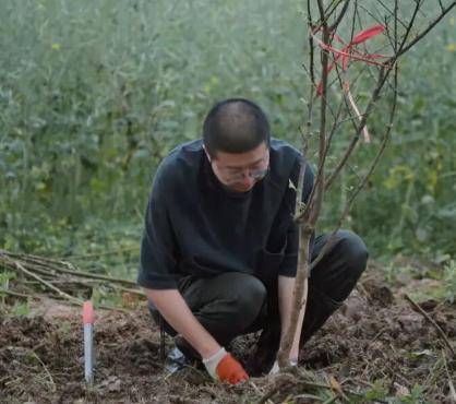 彭昱畅挥着锄头挖树坑,汗顺着下巴滴进地里,擦把汗继续干。