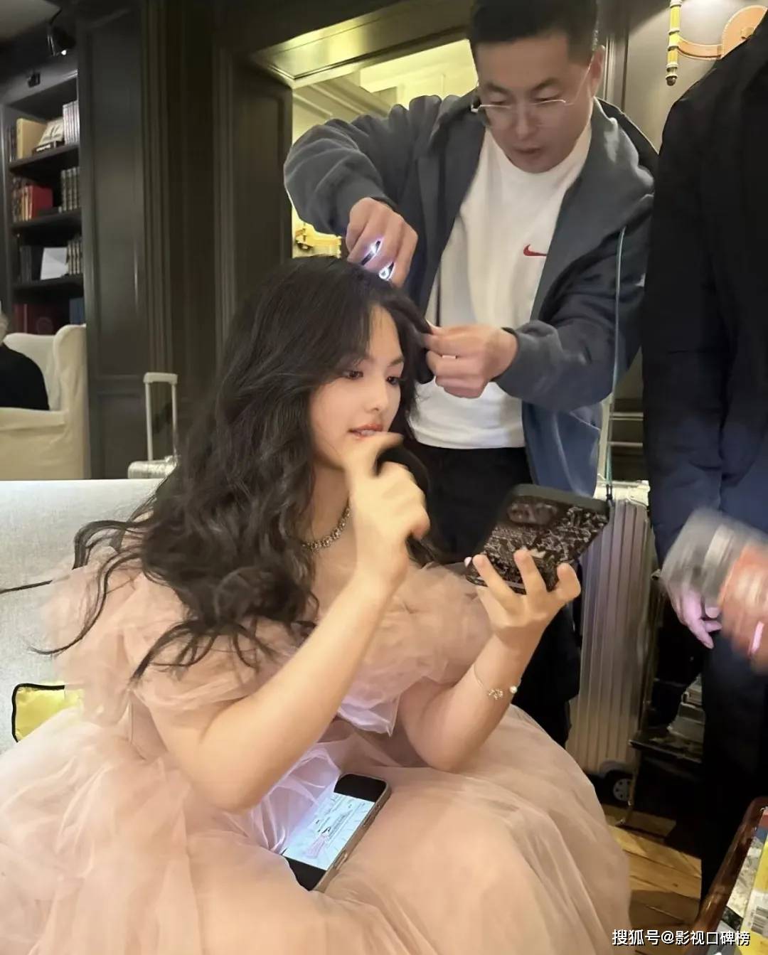 李湘还大方晒出,有一个戴着眼镜的造型师专门为李湘整理头发。王诗龄则拿着手机在看,很惬意。