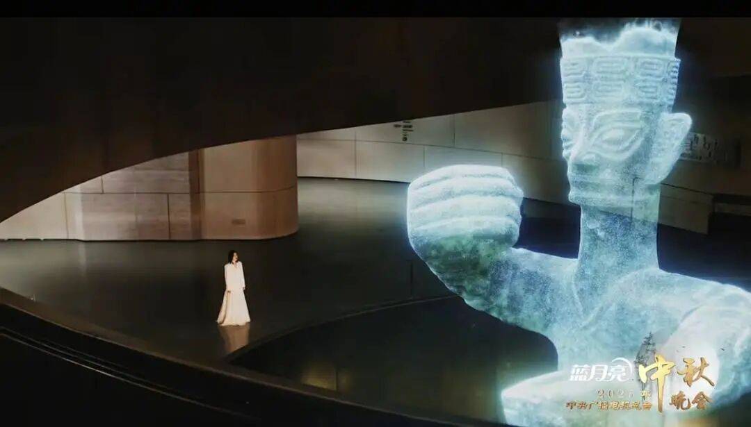 由尚雯婕表演的创意节目《青铜》,三星堆青铜器与AI机器人展开一场跨越数千年的文明对话,成为整场晚会科技与文化融合的一大亮点。此前,晚会总撰稿杨启舫介绍,“三星堆承载文明记忆,AI象征未来,现场演绎定格当下,形成三位一体的艺术张力。”