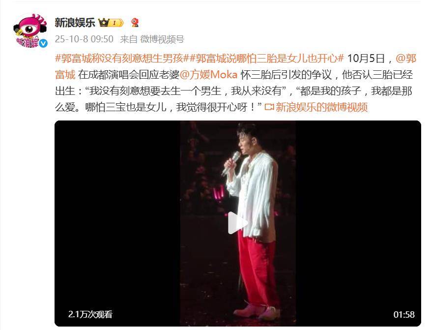 10月8日,据媒体报道,郭富城在成都演唱会上的几句回应,直接把“追生男孩”的传闻锤得粉碎。面对港媒爆料和舆论猜测,这位天王没有回避,而是选择在舞台上坦诚布公——“我没有刻意想要去生一个男生,我从来没有”,语气干脆利落,毫不拖泥带水。