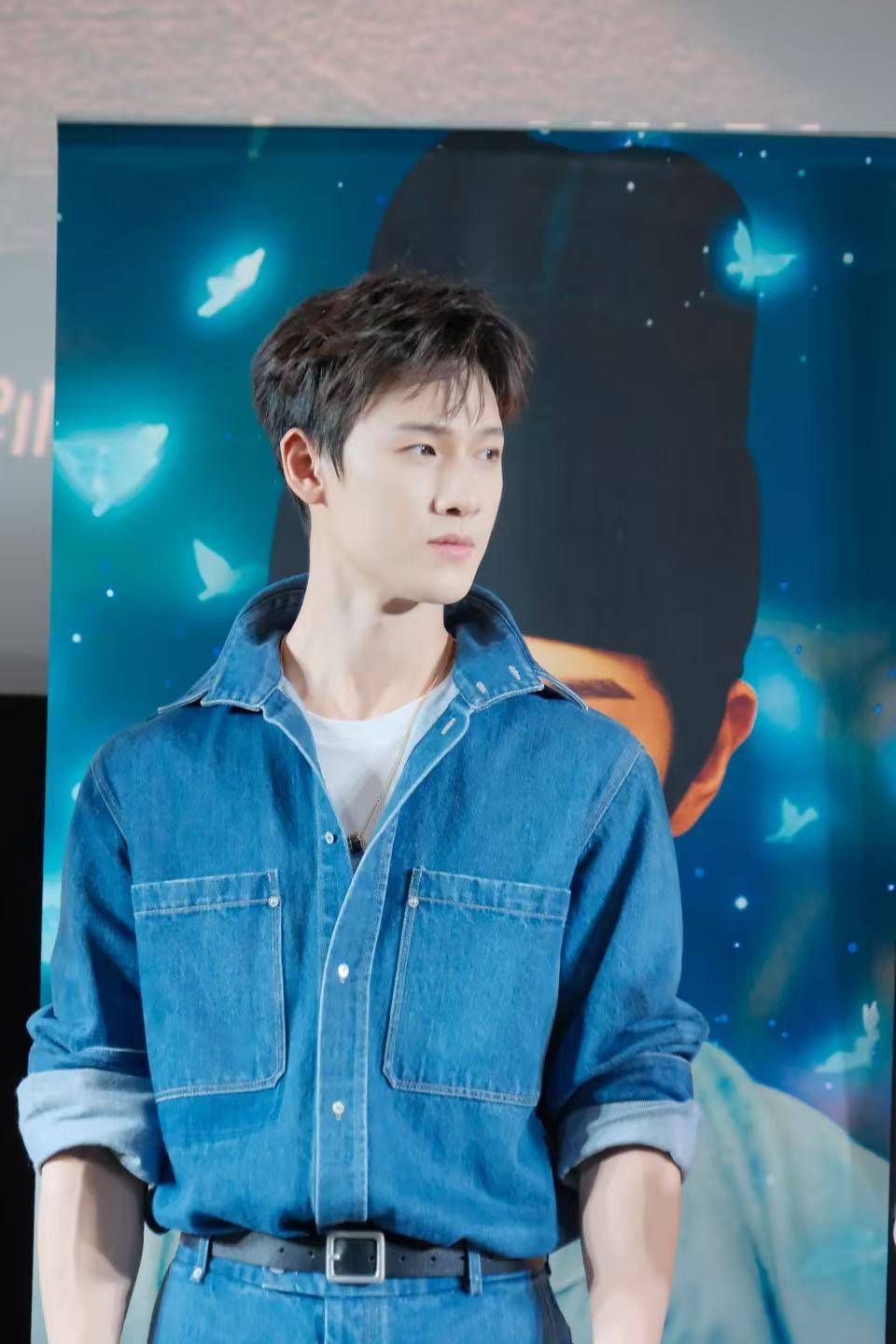 李昀锐身穿蓝色牛仔套装,清爽俊朗;王影璐一袭浅紫薄纱花朵礼服裙,俏皮可爱。