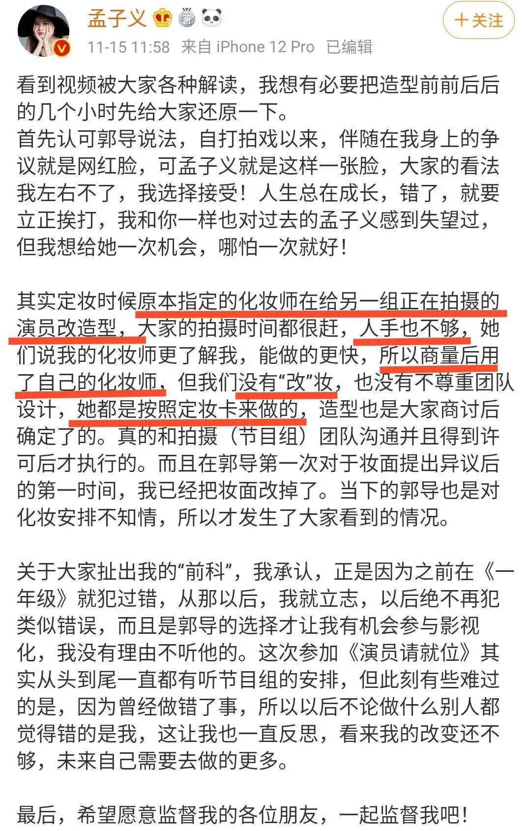 节目组把这段冲突当做宣传噱头,当时也的确上了好几个热搜。尽管后来孟子义和化妆师都出面澄清,说是因为节目组人手不足,她想赶时间才用了自己的造型师,这事儿经过节目组同意,她的妆也是按照定妆卡化的。