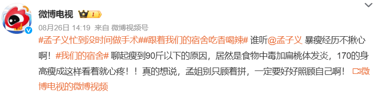 还有今年8月时,她因为扁桃体囊肿暴瘦,粉丝都很担心,但孟子义只休息了一天,打完消炎针就又复工了。