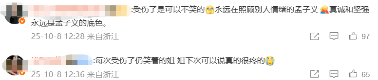 这么看孟姐说自己“皮实”还真不是无稽之谈,但粉丝还是会心疼她,并且控评“受伤了是可以不笑的”、“你不用一直照顾别人情绪”来安慰她。