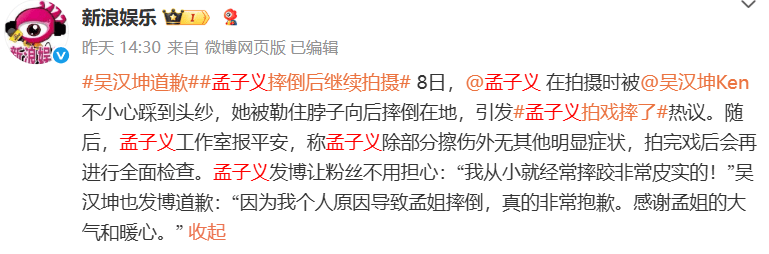 合作演员吴汉坤火速发微博道歉,孟子义上线之后回复也很快,说自己“没事哒,已生龙活虎”。