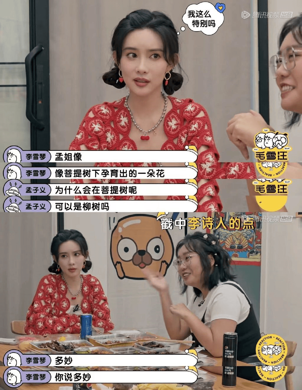 一旦接受了孟子义只是“嘴比脑子快”的设定,就很容易理解李雪琴为什么说她是“菩提树下开出的一朵花”,她就连听到这个夸奖时都很懵懂,可见此人的超绝钝感力,不光体现在节目中。