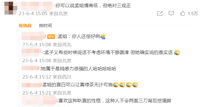 看节目的网友也没少骂她没礼貌、自以为是、没分寸感、讲话不顾忌别人感受,但正是这份被诟病的“低情商”,后来为孟子义的路人缘带来了转机。