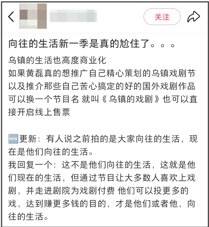 网友吐槽一针见血——“有人说之前拍的是大家向往的生活,现在是他们向往的生活。我回复一个:这不是他们向往的生活,这就是他们现在的生活,但通过节目让大多数人喜欢上戏剧,并走进剧院为戏剧付费,他们可以投更多的戏,达到赚更多钱的目的,才是他们或者他,向往的生活。”