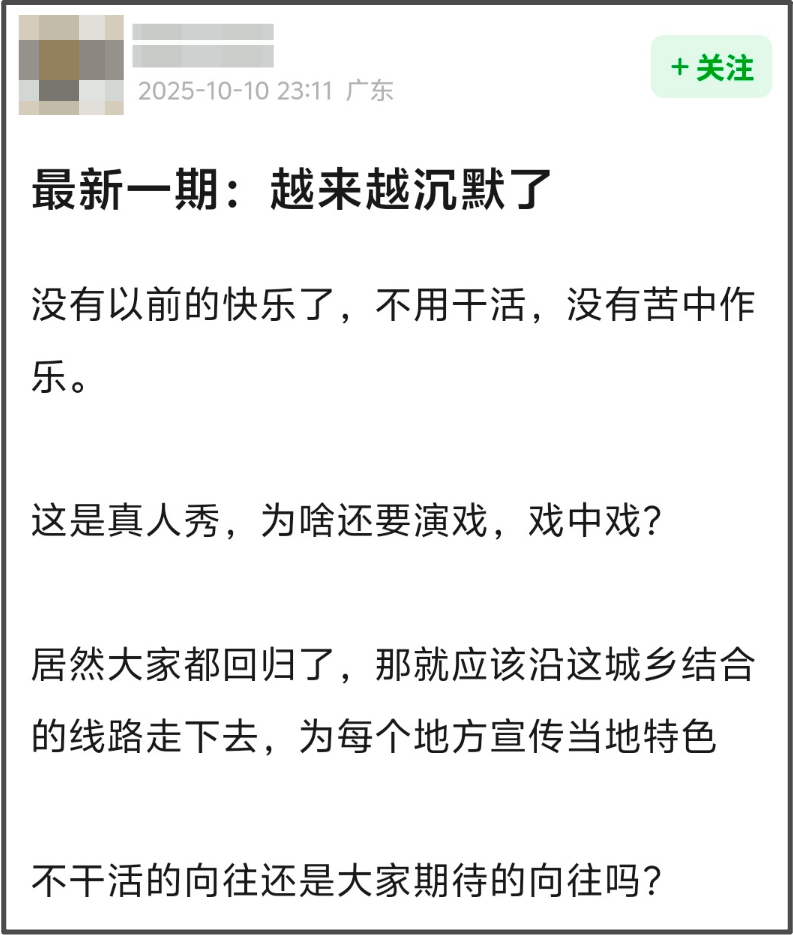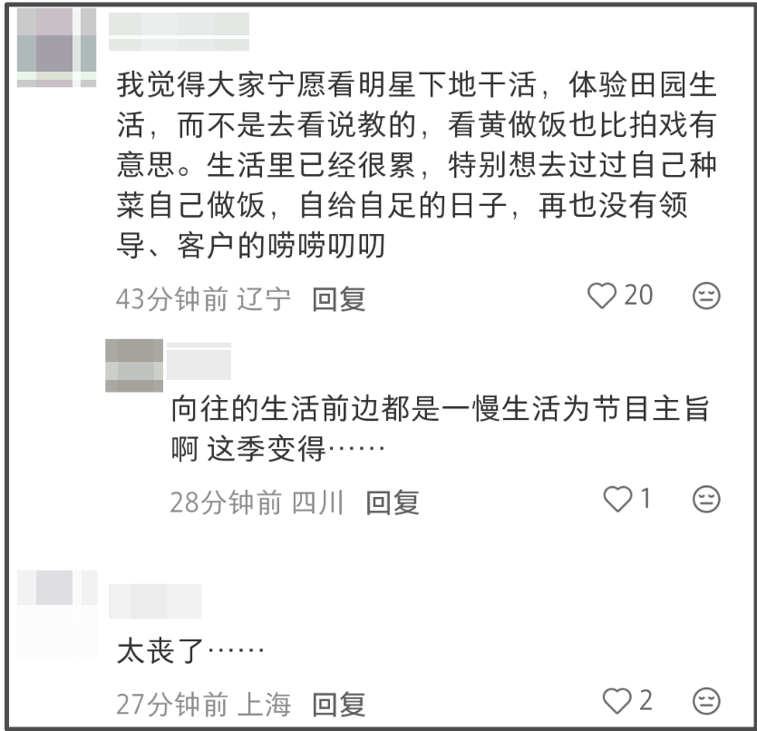 有网友忍不住想问,《向往》到底在干嘛?卖惨吗?搞出一副好似被网评影响的样子,拍不出原有的味道,不如不要做了。