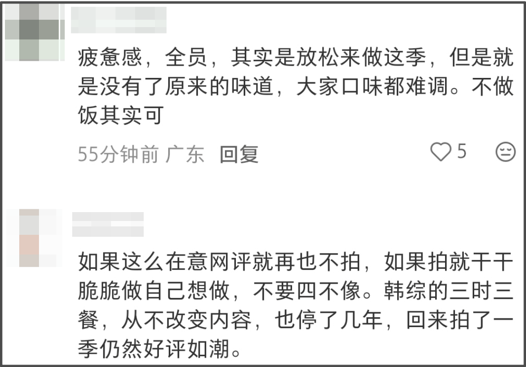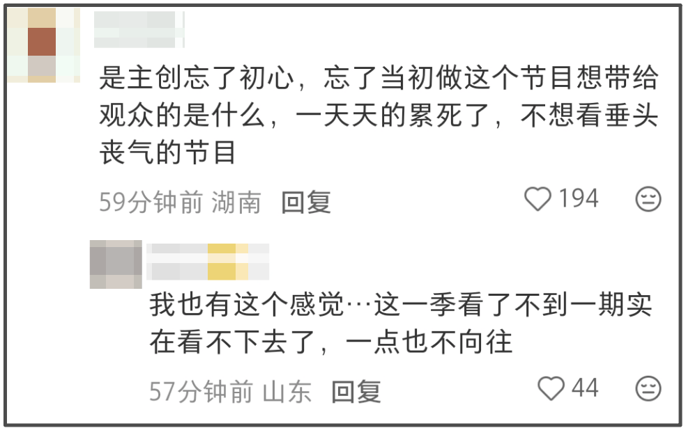 其实相较于节目形式,更多观众吐槽的是节目整体氛围感,给人的感觉越来越丧,看着一点都不开心,再没有苦中作乐了,观众只看到他们的苦,没办法感同身受他们的乐。