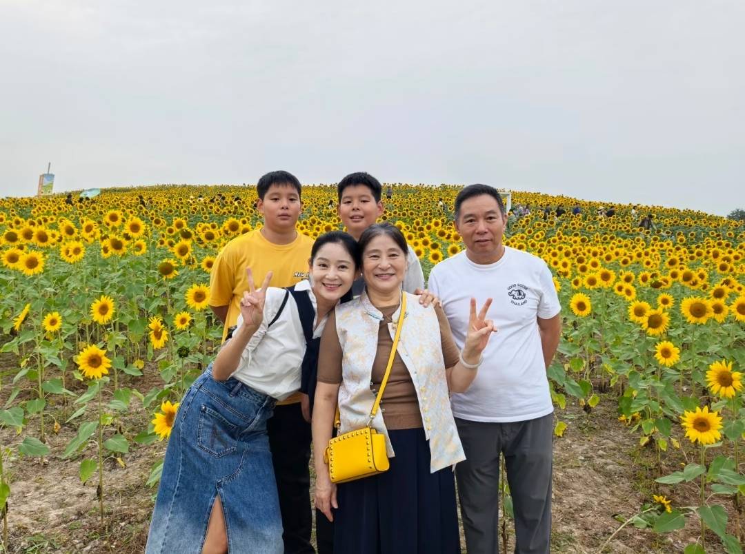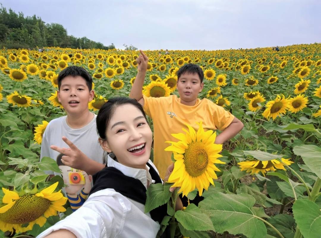 王媛可还带着家人去山上看了向日葵花海。照片里的她笑得一脸灿烂,双胞胎儿子站在她身后,长得是又高又壮,身高已经超过妈妈王媛可了,虽然看着有点胖,但五官长相还是很帅的。