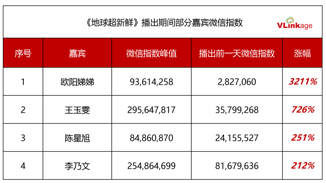 节目的高热度、受众的高满意度,以及社交平台不断发酵的出圈名场面,不仅让节目深入人心,也拉升了嘉宾的全网热度。下图为部分嘉宾微信指数峰值涨幅,比如因“虎妞”性格让观众惊艳不已的王玉雯、因“反差萌”而带来不少爆笑名场面的李乃文、小太阳般明朗可爱的欧阳娣娣、在节目中从i人向e人蜕变的陈星旭等等,这些“综艺新人”因讨喜的真实个性流露,在社交平台人气大涨。