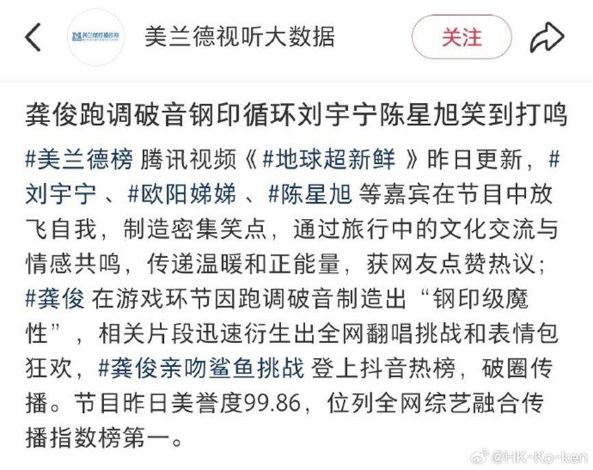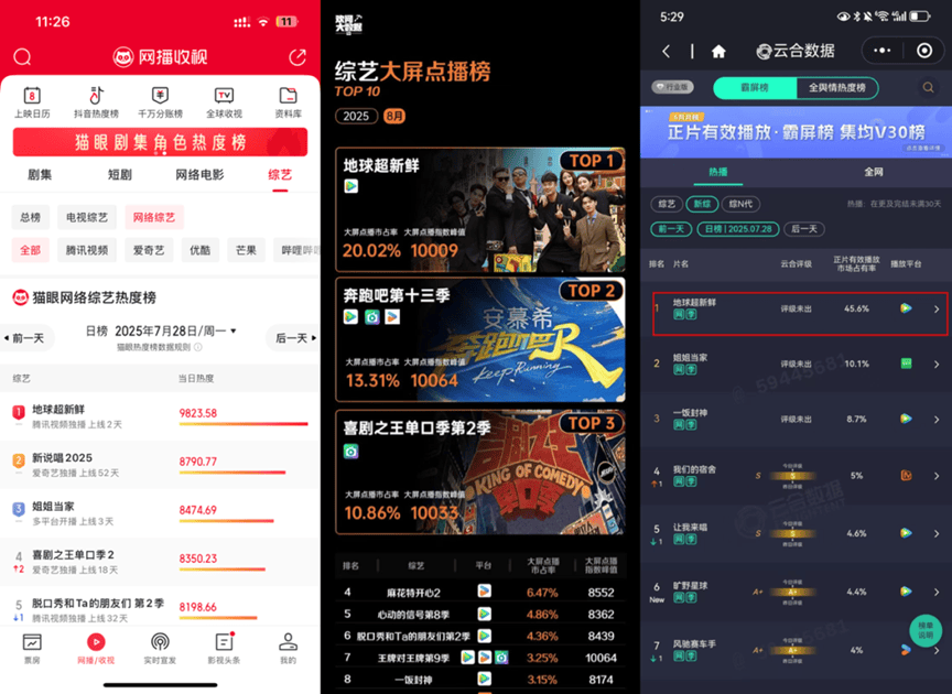《地球超新鲜》已火成2025年的现象级综艺IP。腾讯视频站内,节目首播热度26000刷新平台年度综艺纪录;百度指数破6万成为综艺史上断层第一。上线两月,近60天登顶猫眼网综热度榜、Vlinkage网综指数日榜;欢网2025综艺大屏点播榜TOP1、以20.02%的大屏点播市占率遥遥领先,也是25年首次点播指数破万的新综艺;云合新综艺市占率超过45.6%,在新综艺中实属罕见。