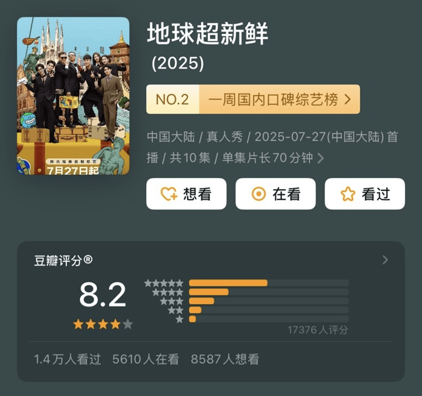 其次,节目中段。开播一个月后,《地球超新鲜》成功挤进腾讯视频年榜;并在豆瓣开分8.0分后火速上涨至8.2分。