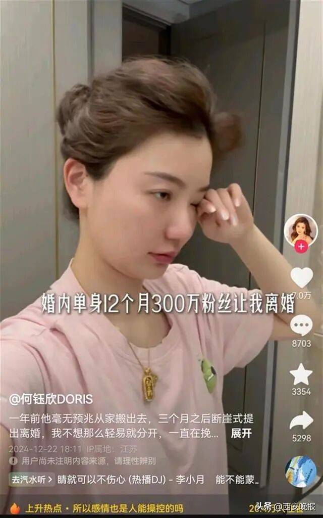 但是2024年12月初, 何钰欣发布视频称,去年丈夫毫无预兆地提出离婚,她坚持不离婚。10月丈夫态度转变,她给了丈夫十五天时间,然而这期间丈夫没有主动发信息关心她,“每天在出差”。她觉得丈夫只是想堵住网友的嘴,并非真心想修补感情。