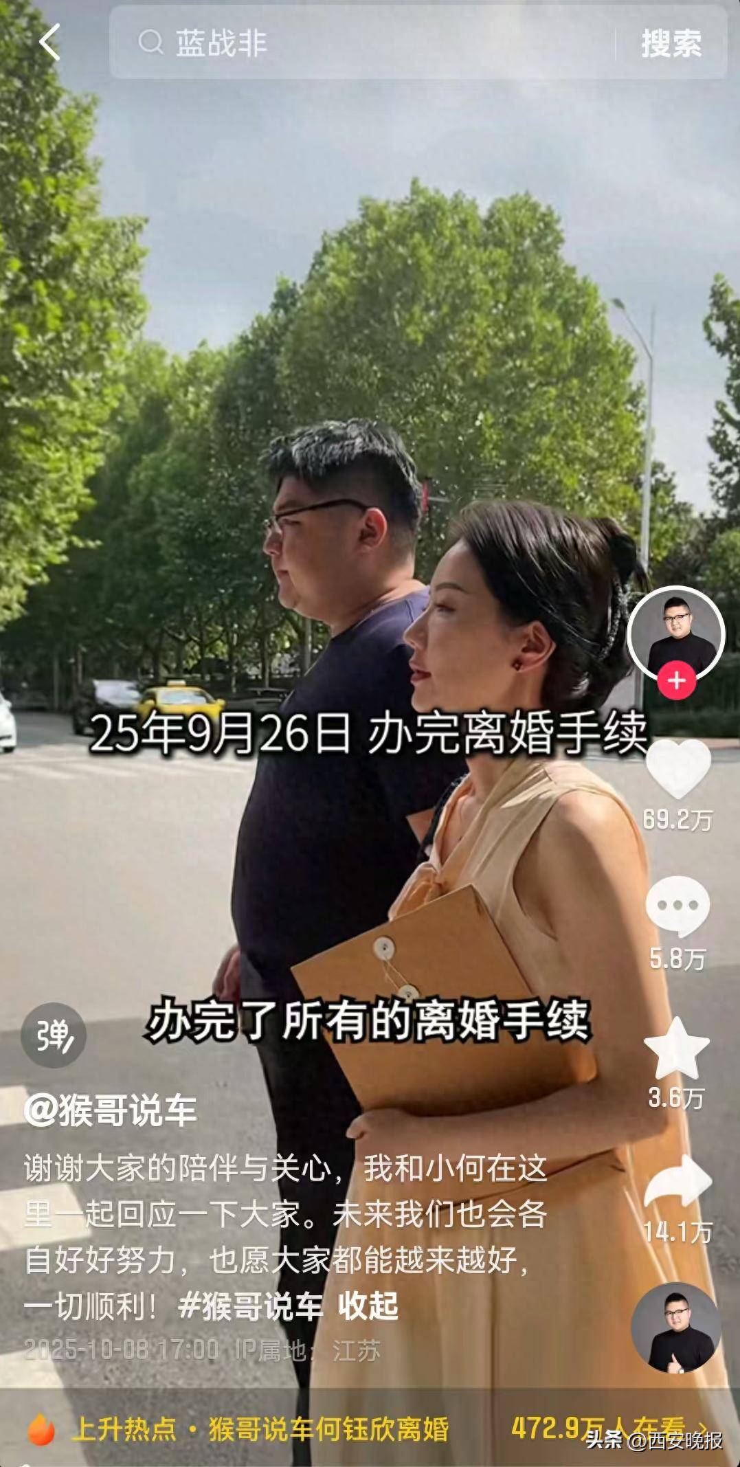 10月8日,千万粉丝网红“猴哥说车”发布视频称, 自己与何钰欣已在9月26日办理离婚手续, “缘分尽了,和平离婚”“生活不是剧本,总会有一些意料之外的分歧”。