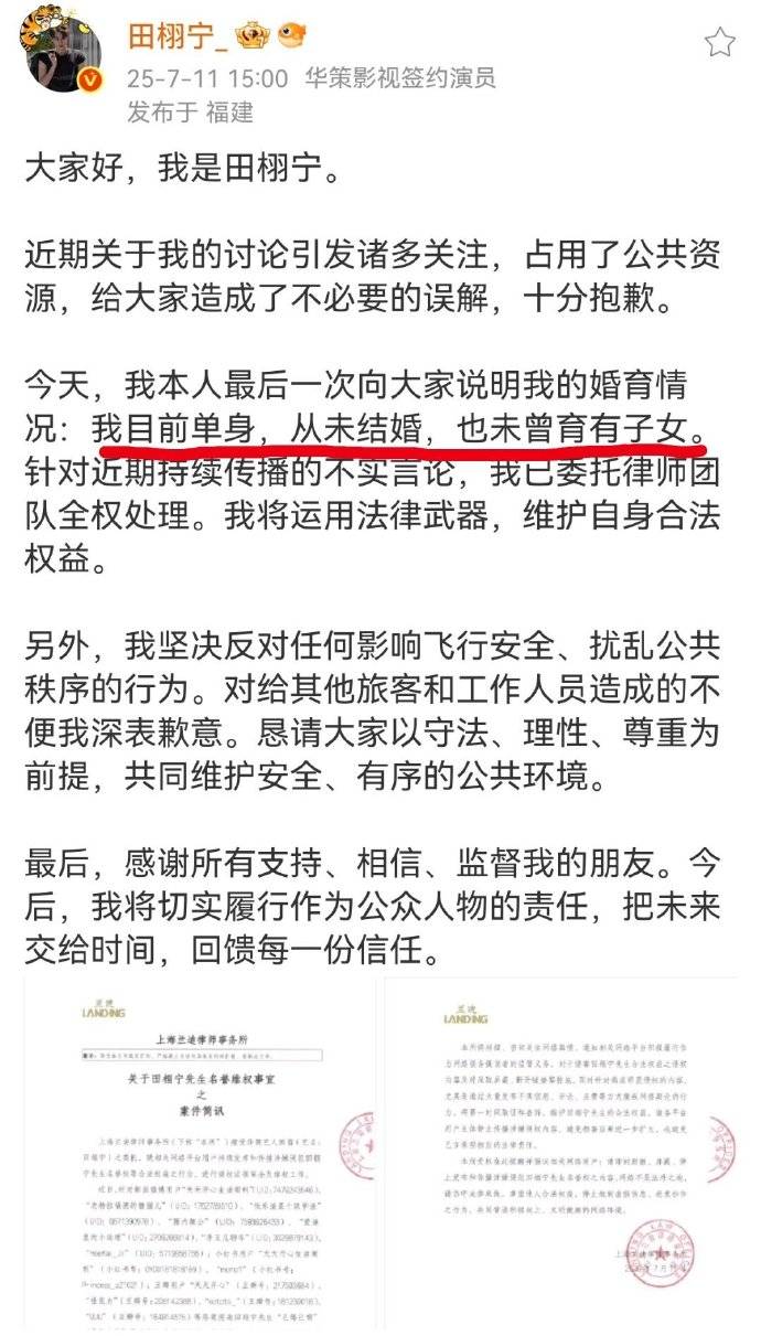 然而,这波甜蜜互动却瞬间点燃舆论——只因田栩宁团队曾在2025年7月11日发布官方声明,白纸黑字强调他“目前单身”,还通过律师否认了“已婚已育”“孕期出轨”等传闻。如今牵手视频一出,网友立刻翻出旧账,嘲讽道:“原来‘单身’仅限发声明的那一秒?”“老雷凭一己之力拉低内娱单身声明含金量!”