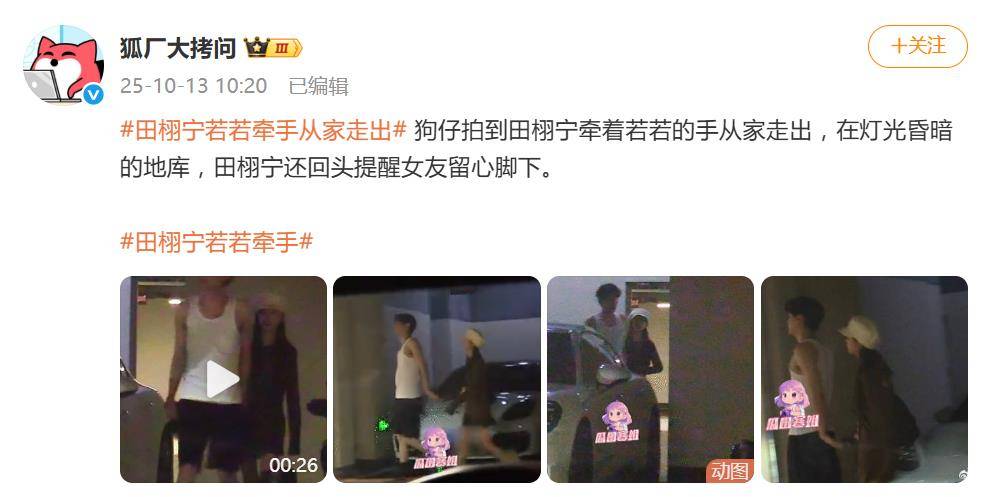 10月13日,娱乐圈突然炸出一段视频:田栩宁被拍到牵着女友若若的手,从家中地下车库并肩走出。画面中,灯光昏暗的地库裡,田栩宁不仅全程紧握若若的手,还频频回头提醒她“留心脚下”,被网友形容为“细节裡藏不住亲密”。