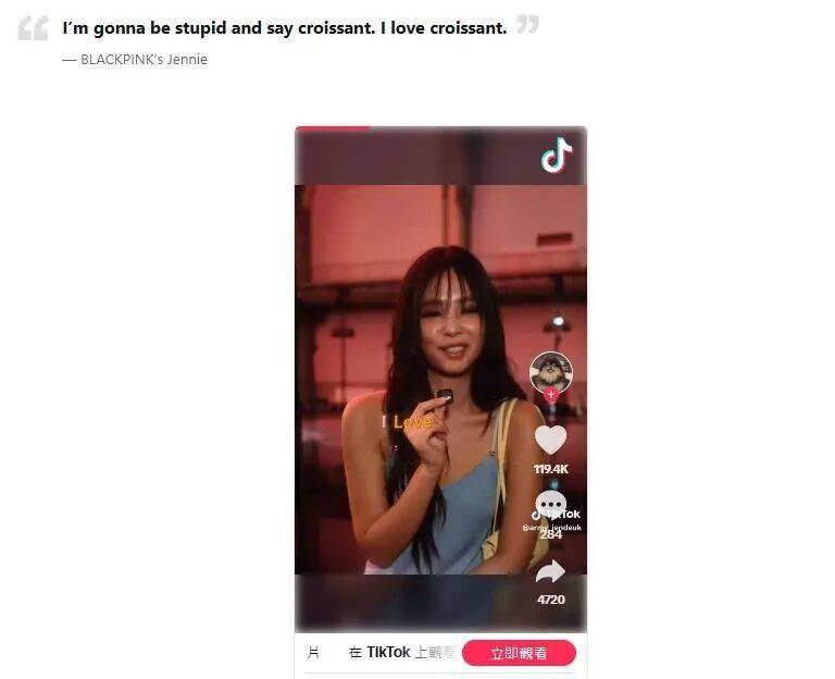 谁也没想到,没过几天,同一座城市、另一场大秀后,Jennie在接受香奈儿采访时被问到“最喜欢的法语词”,她低头一笑,轻声答:“可颂。”还补了句:“我超爱可颂。”