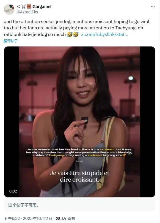 时机太巧,内容太悬。长期紧盯二人互动的粉丝立刻沸腾,认定这不是偶然,而是Jennie对V那则热传视频的“隔空呼应”。一时间,“可颂梗”席卷社交平台,有人激动表示:“这简直是暗戳戳发糖!”