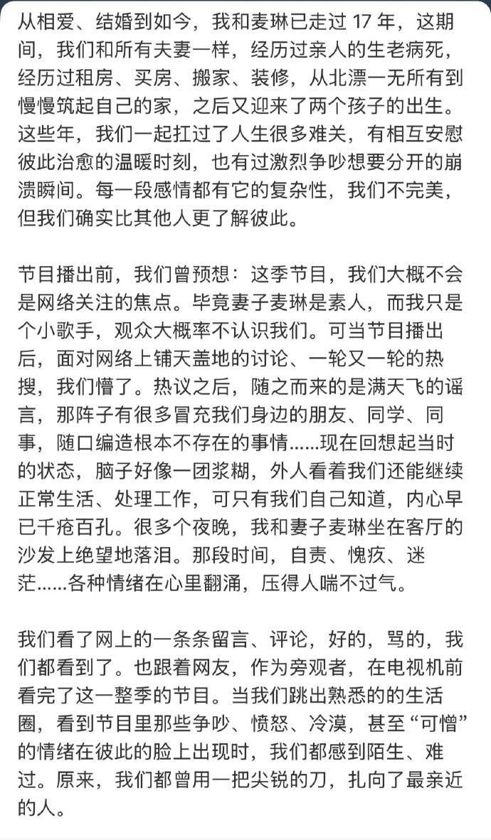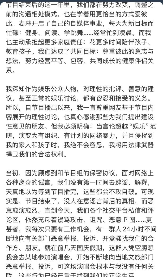 李行亮在发文时坦言,最初以为自己和素人妻子“不会是网络焦点”,毕竟“我只是个小歌手”。但节目播出后,热搜与谣言的巨浪瞬间吞没了他们的预想。如今,这场风波已不仅是娱乐话题,更成了一场关于网络暴力边界、真人秀伦理与普通人尊严的公共讨论。