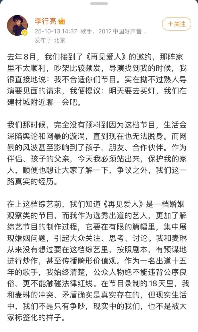 10月13日,歌手李行亮的一篇长文撕开了综艺《再见爱人4》的温情面具。文中详细披露了他与妻子麦琳因参与节目而遭遇的漫天网暴,甚至让这对相伴17年的夫妻在无数个深夜“绝望落泪”。这场以“情感观察”为名的节目,最终演变成一场真实的生活风暴。