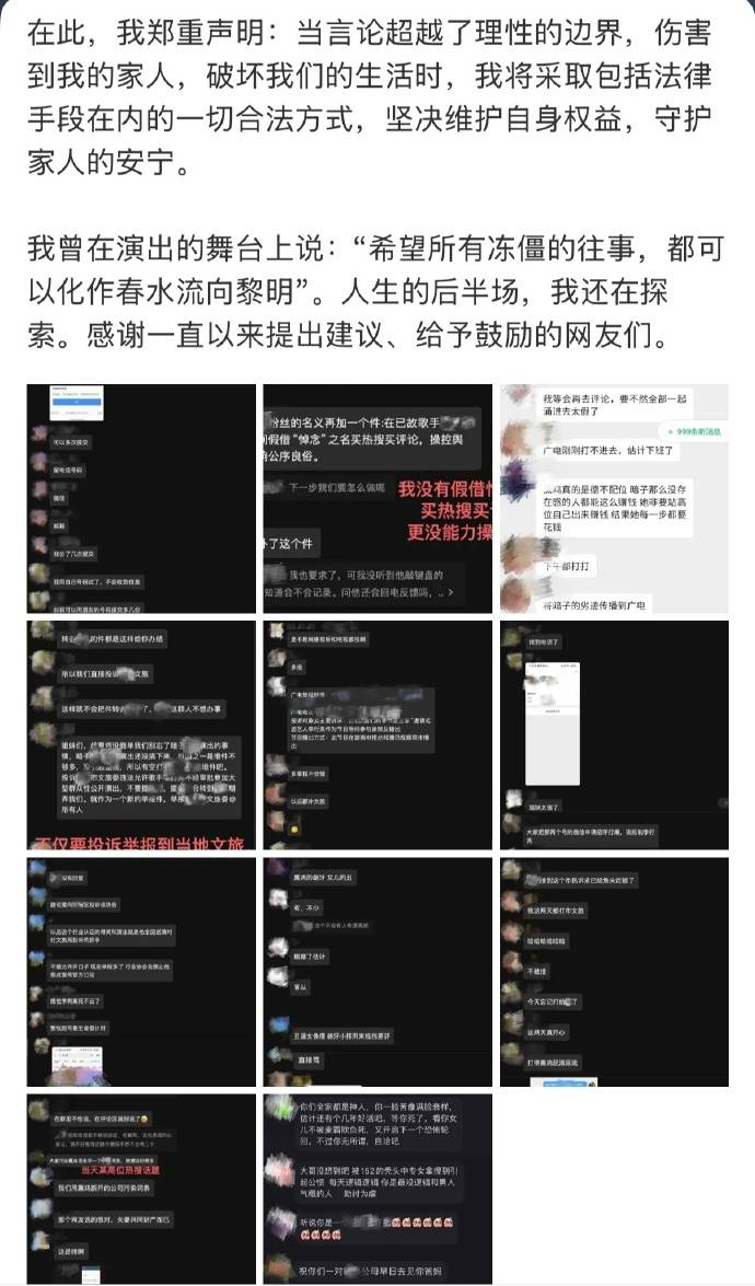 恶意造谣:多人冒充其亲友编造虚假信息,真假难辨的“黑料”肆意传播;骚扰与举报:合作方、朋友遭“开盒”骚扰;更有人24小时向文旅部门恶意举报其无关演出,试图截断其工作机会;语言暴力:私信与评论区充斥谩骂、诅咒及恶意P图,甚至波及孩子与朋友。