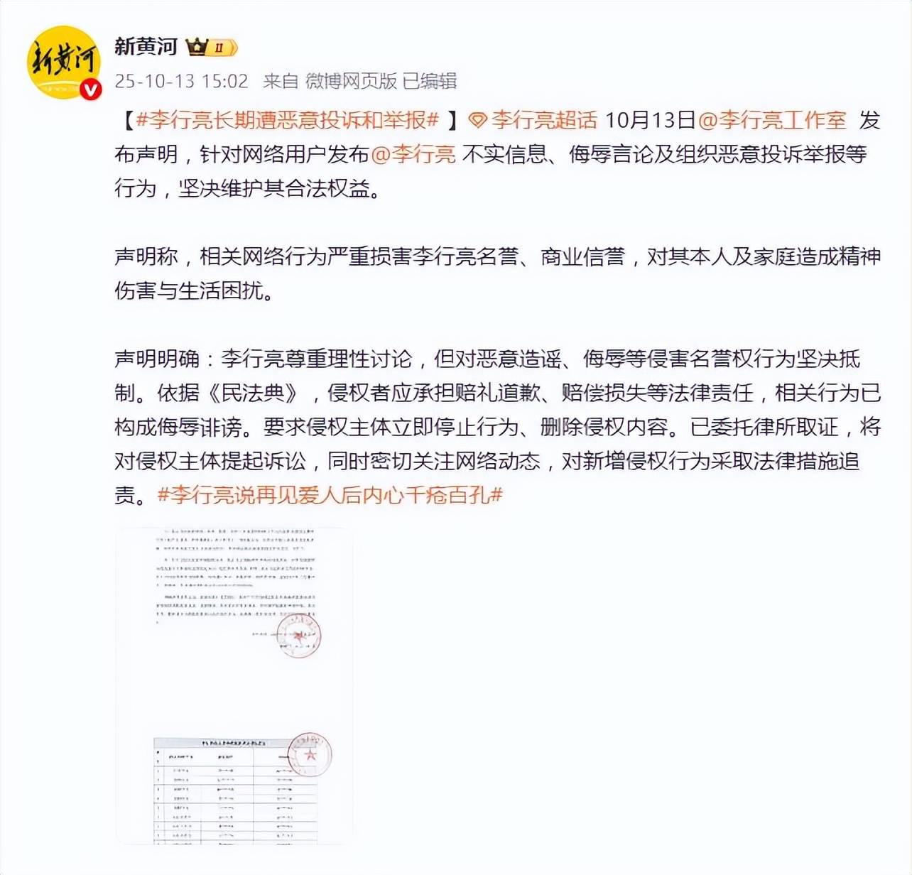 李行亮在长文中划清底线:接受理性批评,但坚决抵制越界网暴。若言论伤害家人、破坏生活,必将采取法律手段。同日,李行亮工作室发布声明,委托律所对侵权内容全面取证并提起诉讼,并晒出多张恶意举报截图,直指网络行为已严重损害其名誉与商业信誉。