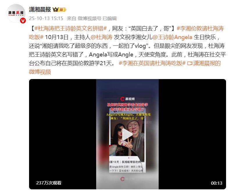 10月13日,杜海涛一条为王诗龄庆生的微博,意外在网络上演了一场“找茬大会”。原本温馨的祝福现场,硬是被眼尖的网友揪出了两处硬伤——不仅把中文“茁壮成长”写成了“茁长成长”,更将王诗龄的英文名“Angela”(天使)误拼成了“Angle”(角度)。这一“神操作”瞬间点燃了围观群众的吐槽热情。