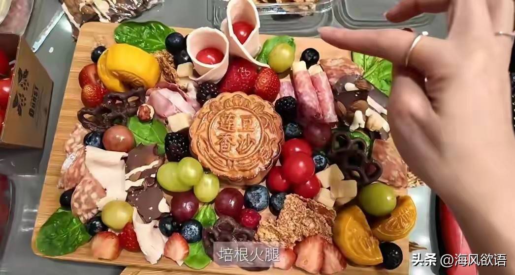 徐朵也特懂事,偷偷学做了中西合璧的月饼拼盘,把妈妈带来的传统月饼和水果、芝士摆得超好看。