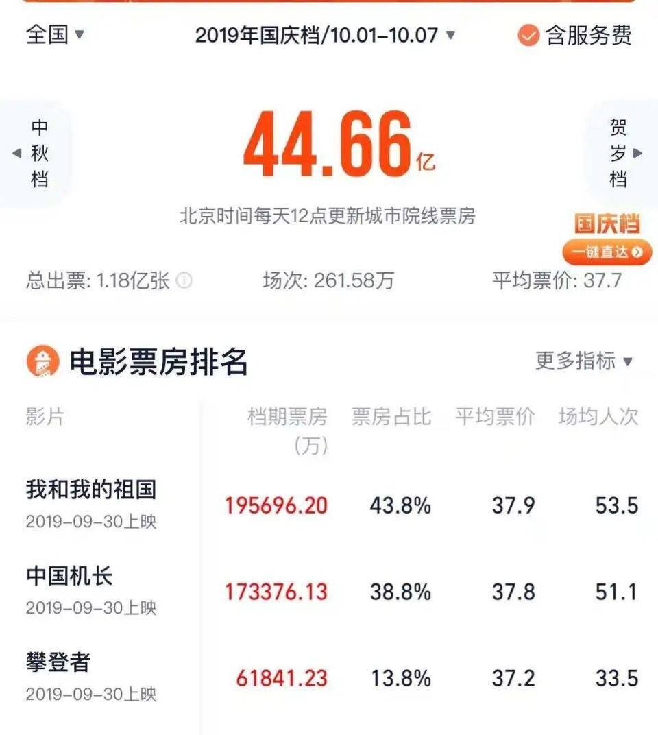 在这种缺乏强力牵引的情况下,整个档期的票房表现自然难以达到预期。回顾历年国庆档的表现,2019年凭借新中国成立70周年的举国欢庆氛围,以及《我和我的祖国》《中国机长》等优质影片的集中爆发,创造了44.66亿的票房纪录;2020年因疫情后影院复工,积压的观影需求集中释放,贡献了39.67亿的票房;2021年则在《长津湖》档期内32亿票房成绩的强势带动下达到43.88亿——